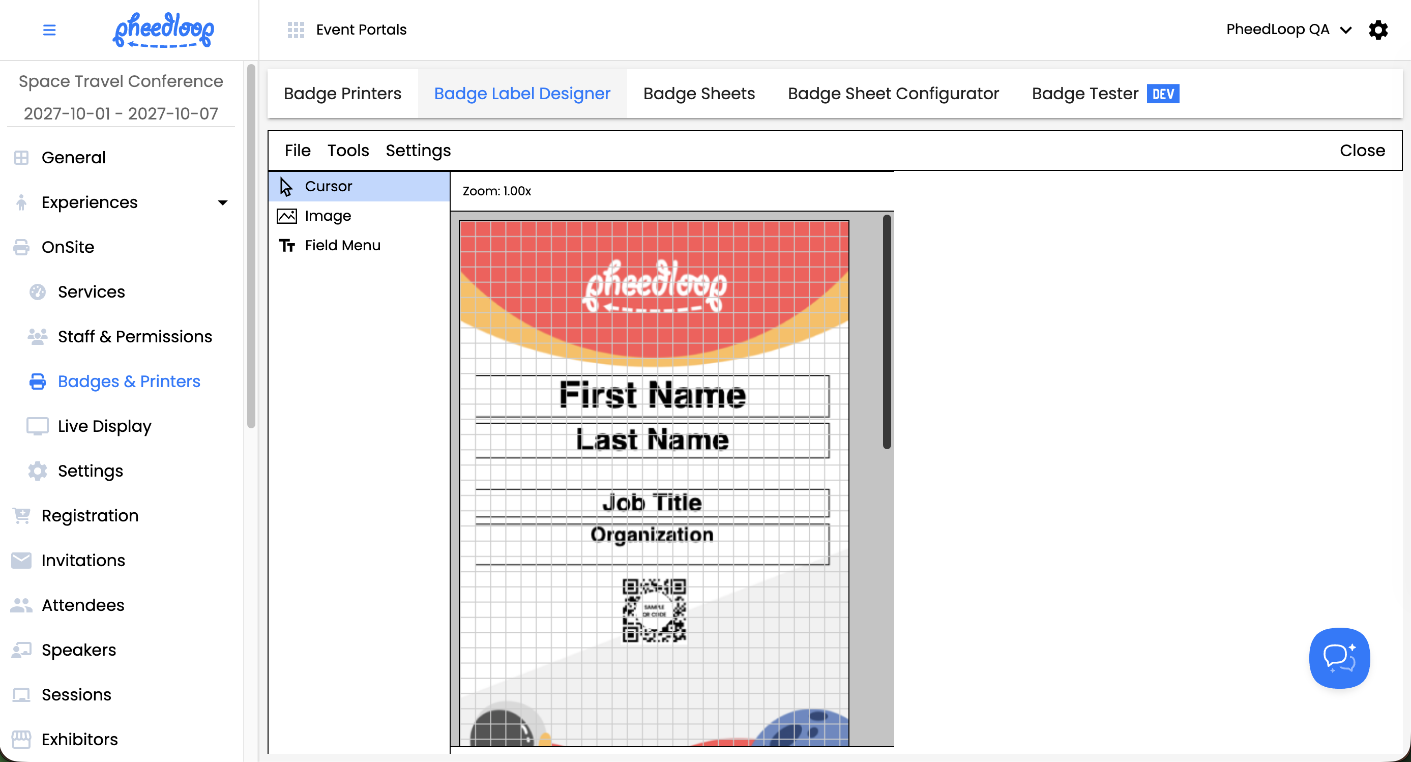 PheedLoop’s Badge Label Design feature is a required step in the process of printing badges for your users attending your event. The Badge Label Designer is used in real time to update exactly what you want to be printed on the actual badges of attendees and generate a preview of where text will appear on the badge. This allows for creative customization and efficient enhancements to make sure your badges look as professional as possible.