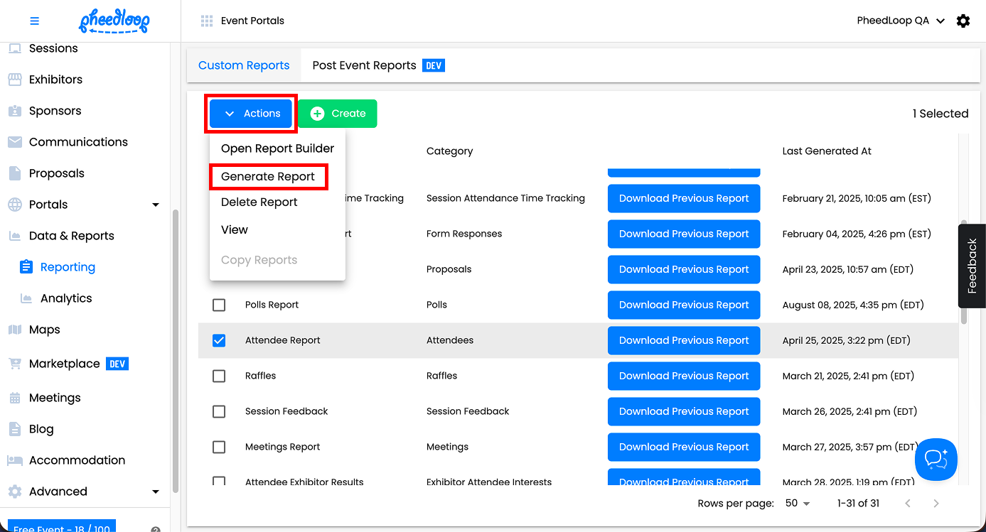 - From the Event Dashboard, navigate to Data & Reports > Reporting > Custom Reports