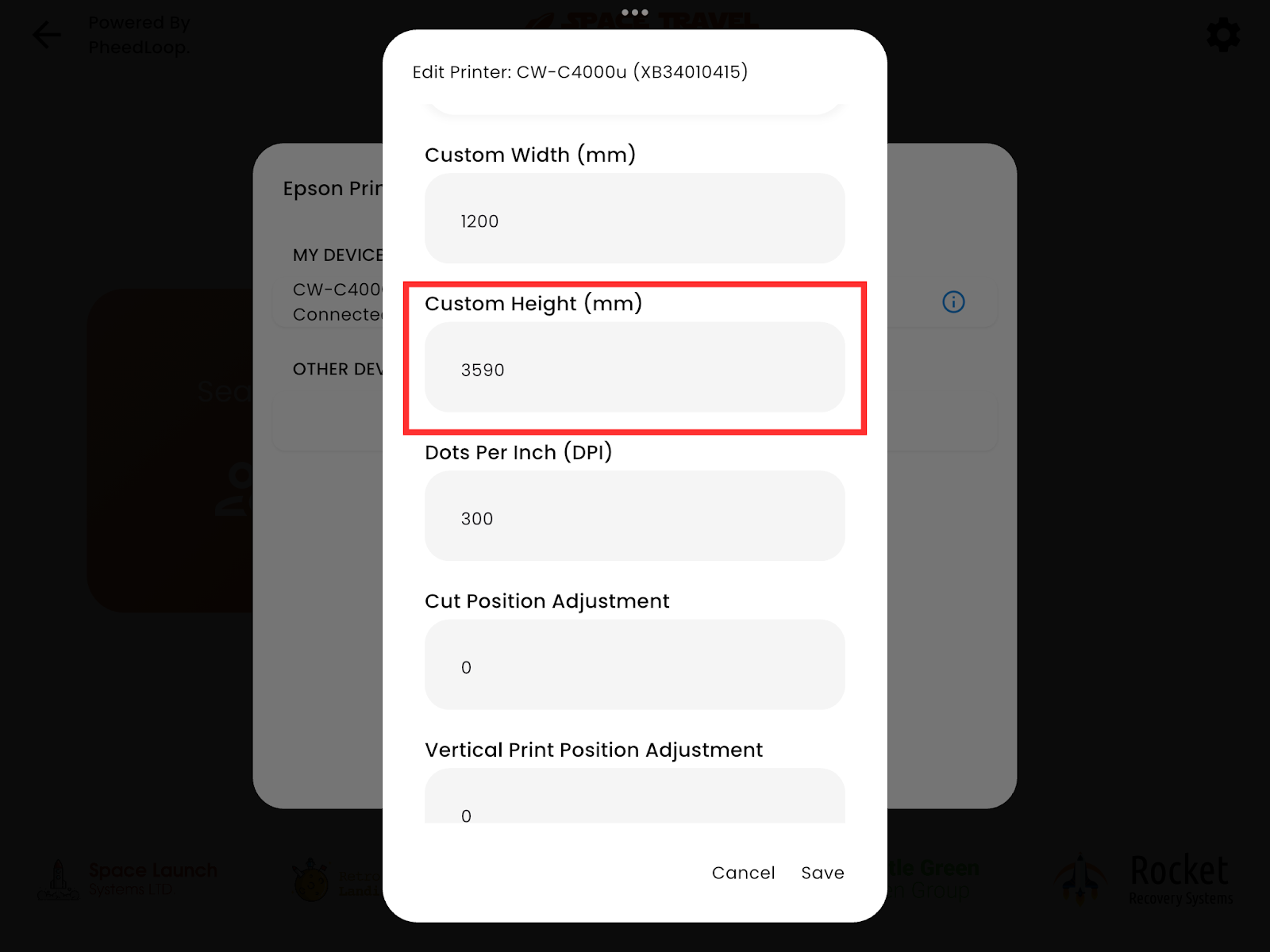 In PheedLoop OnSite, review the print and cut position settings. They may need to be tweaked or reset to default to resolve the issue. Access the printing settings on PheedLoop OnSite and change the Custom Height (mm) from 3600 to 3590. If an issue still arises, try 3580 and 3570 before attempting additional troubleshooting steps.
