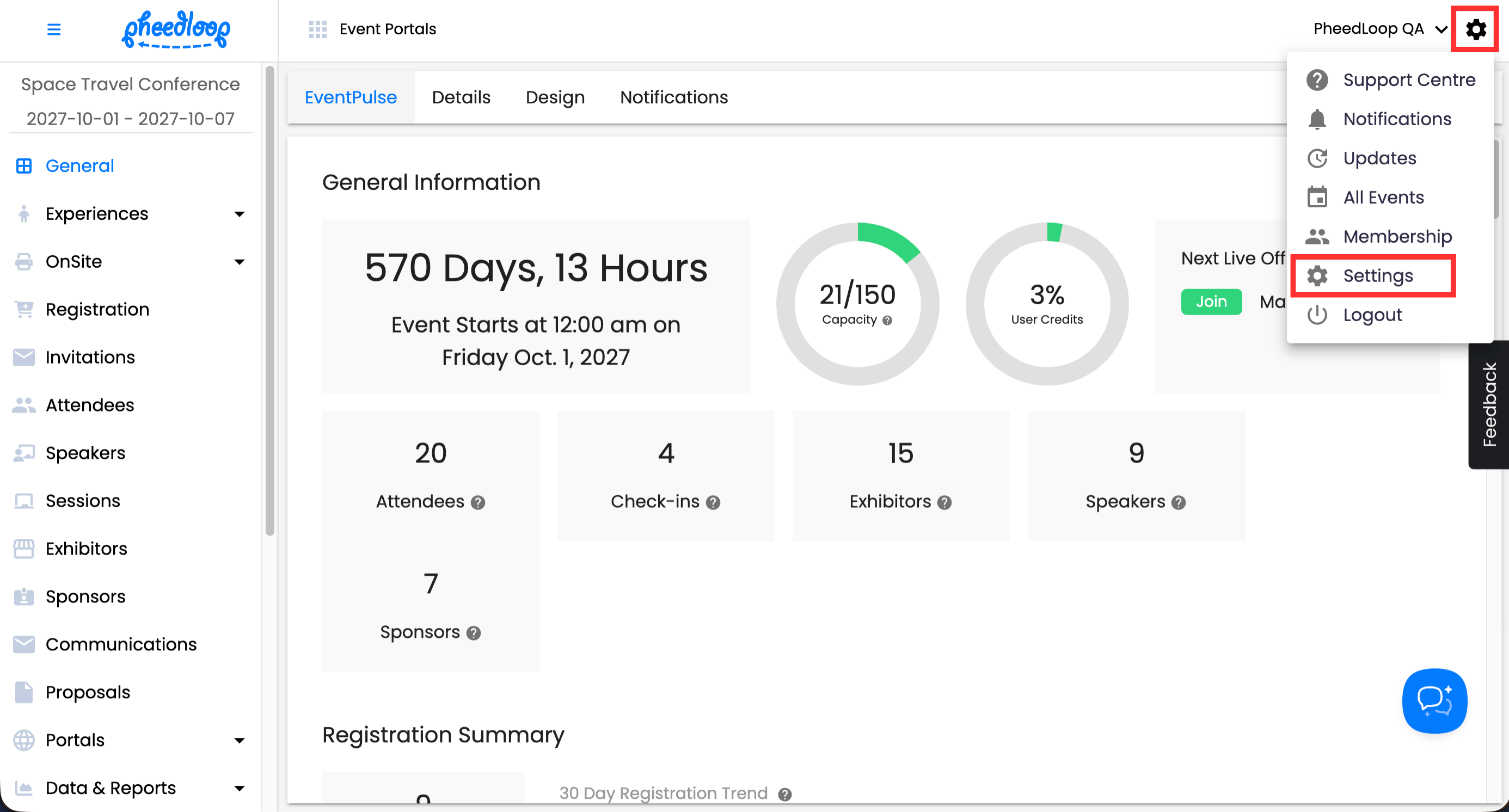 From the Event Dashboard, select the gear icon ⚙️ and select Settings