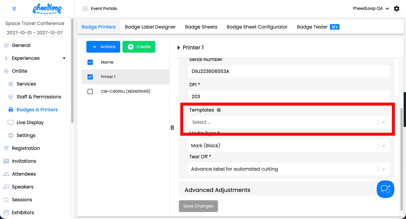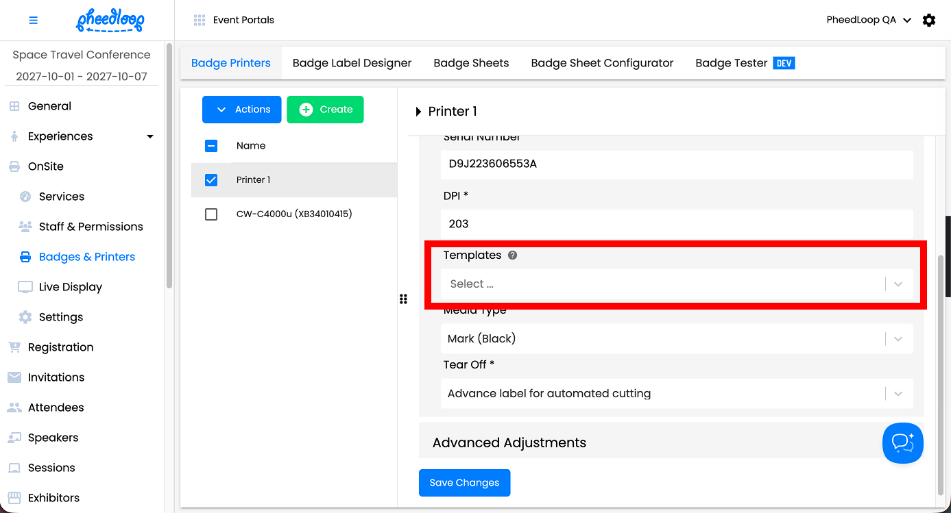 Simply assign the desired template to the printer from the Event Dashboard. The printer will now only be able to print out the selected template. If an attendee without the required tag attempts to print, they will receive an error message.
